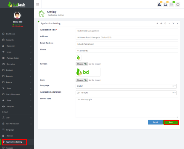 4. Here is Application Settings.procedure is:Application title>address>Email address>phone>Favicon>Upload logo>select language>select application allignment,then click save button