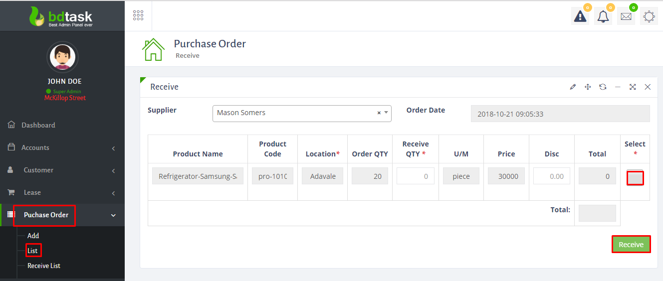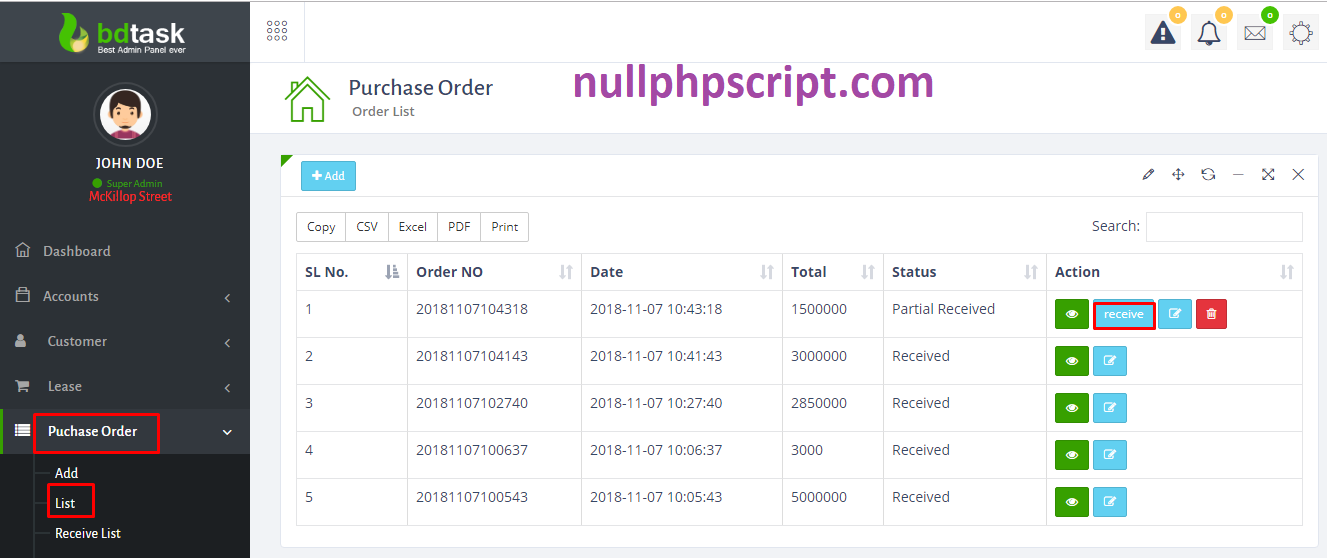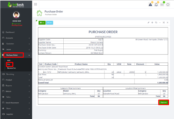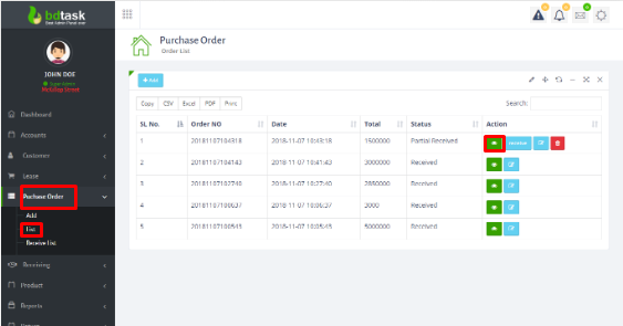 35. Here is the purchase order list.You can also edit,receive and delete here.Fisrt you have to click view button.then you have to approve the button.Then click receive.