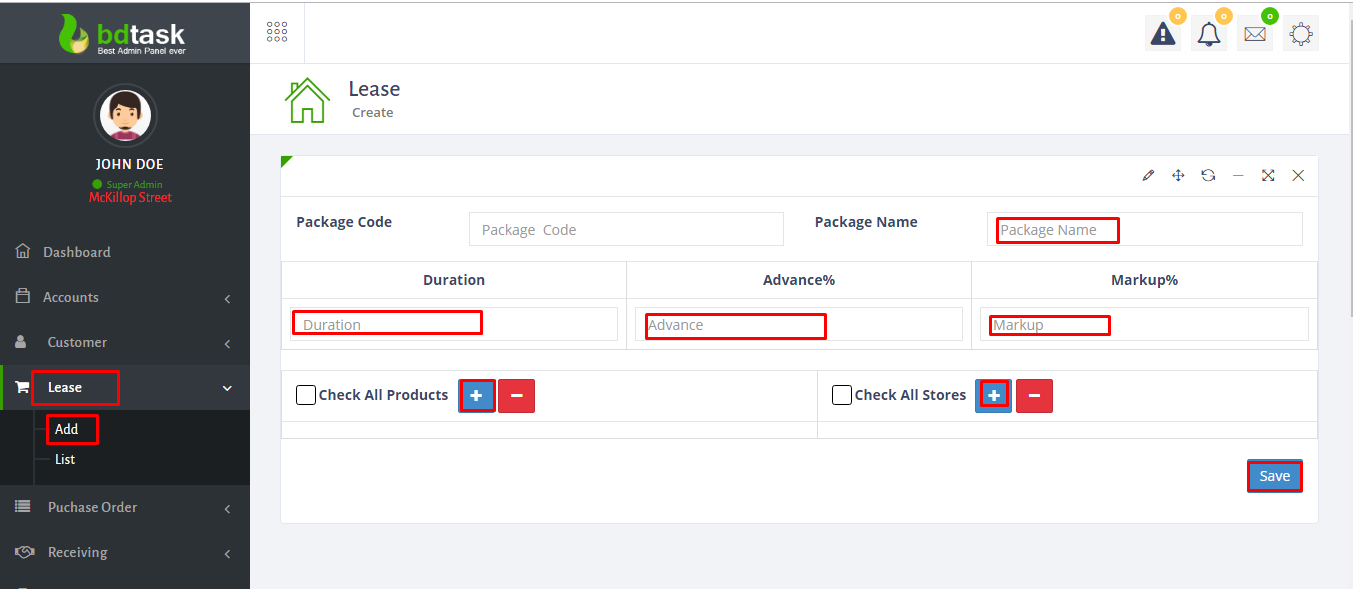 42. For adding lease you have to go lease>add>fill up the form>click on save button.