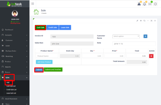 45. For adding cash sale go to sale>add>click on cash sale>then fill up the form>then click on submit.