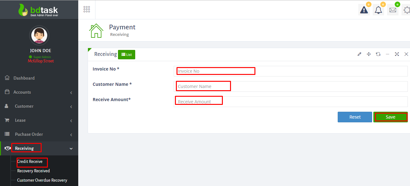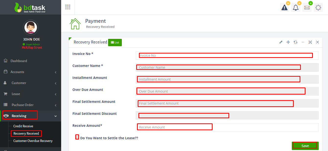 55. For recovery received go to receiving>recovery received>fill up the form>click on save button.