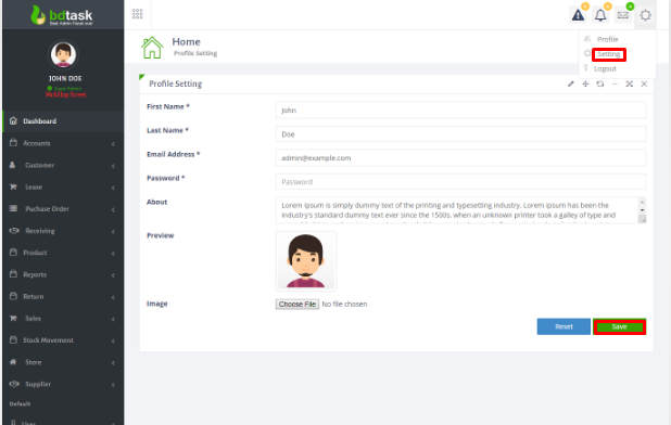 2. To change profile setting just follow Settings icon right side of dashboard and click setting.