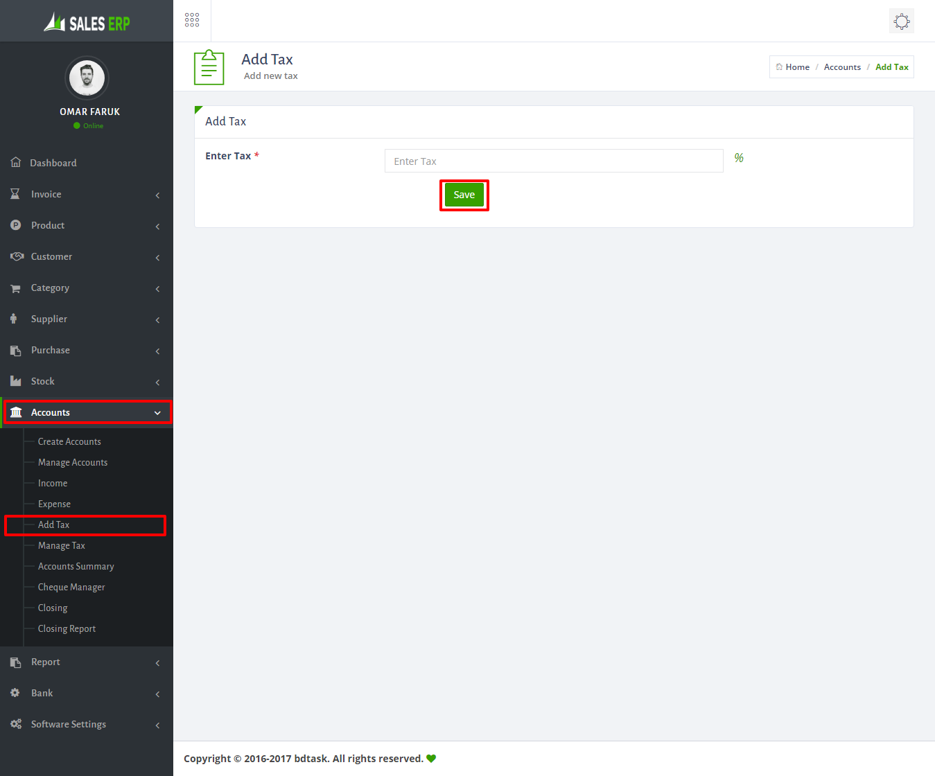 66. To add tax just go to Accounts > Add Tax and fill up information then click save button.