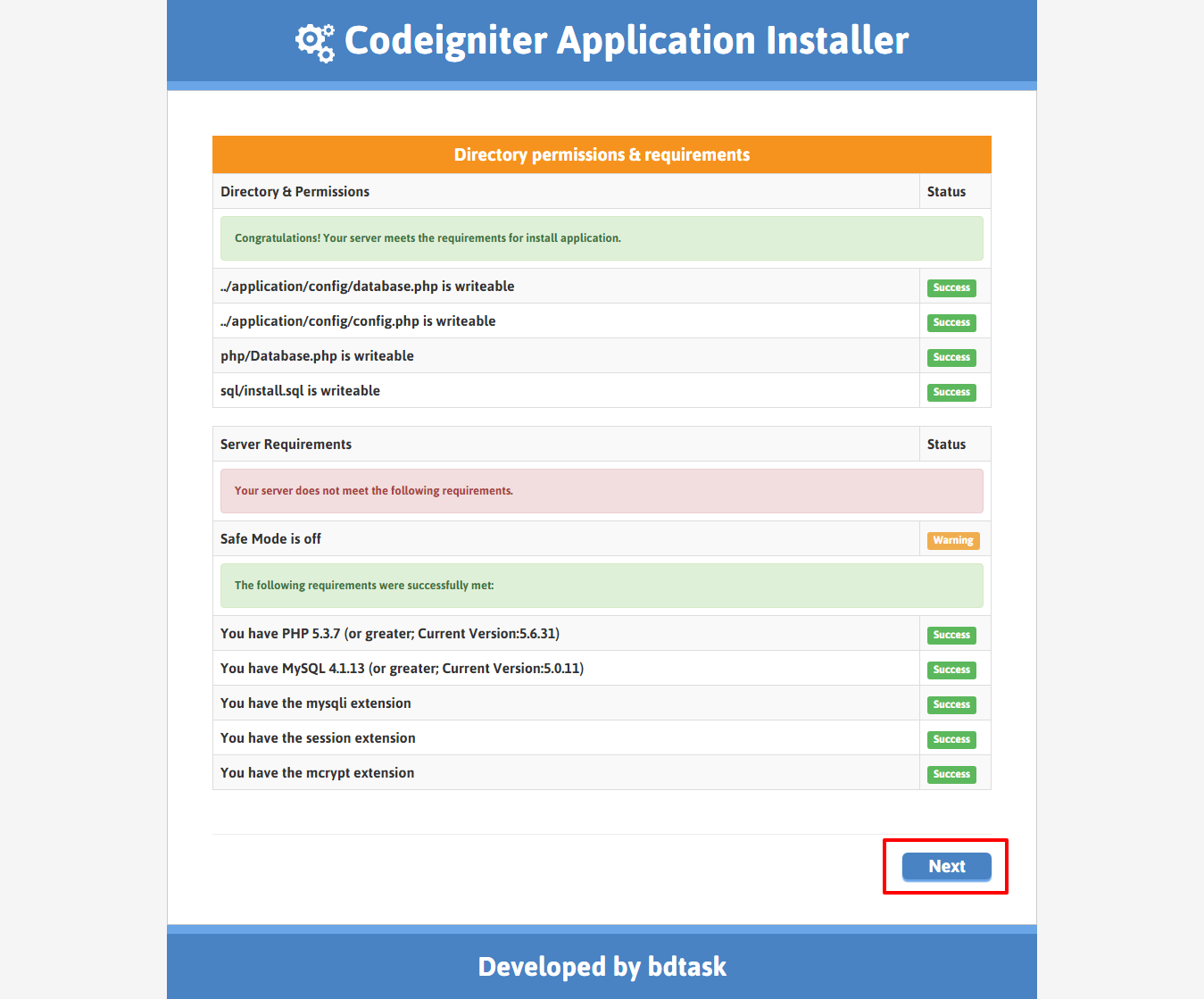 8. Now, Browse your application http://yourdomain.com/install Installer first step showing the directory and server requirements. If all requirements successfully meet then click on Next button