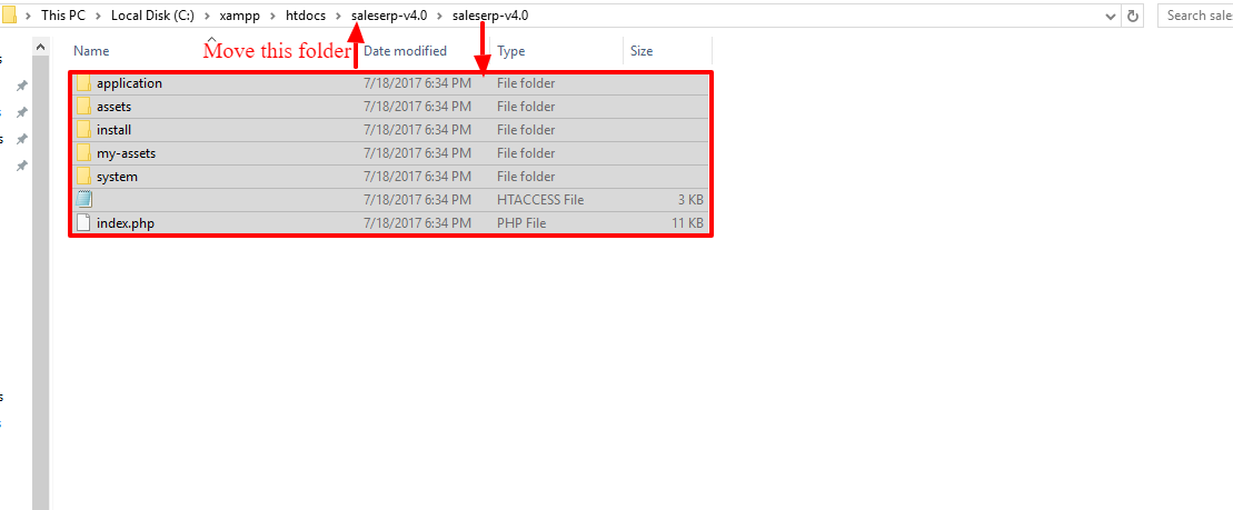 4. Now you just access into the your uploaded folder and then move all folders and files (EX: application, assets,index.php,install and system folders) one step up to public_html directory or can create comment folder and then you can keep it at the folder . Note: Keep in mind about .htaccess file is moved correctly otherwise you cannot access into the admin panel.